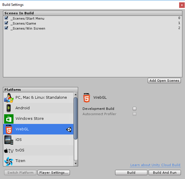 To select the platform your game will run go to File -> Build Settings… and select the scenes to be added in your game. Once done, you should see a screen like the following: